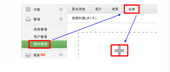 1.进入后台点击“功能”再点击“素材管理”点击“视频”最后点击“加号添加”