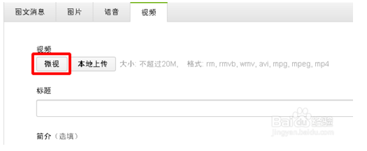 微信公众平台如何添加上传视频,微信平台怎么发送短视频,外部微视频链接怎么上传到微信呢!现在使用微信的朋友不仅止于图片和文字的阅读,如果使采用短视频来互动将会更直观的呈现出不一样的效果,下面小编就演示一次操作微信公众平台视频教程步骤,目前微信上传视频仅支持本地上传和微视的链接,而且大小:不超过20M,支持格式有: rm, rmvb, wmv, avi, mpg, mpeg, mp4等。。