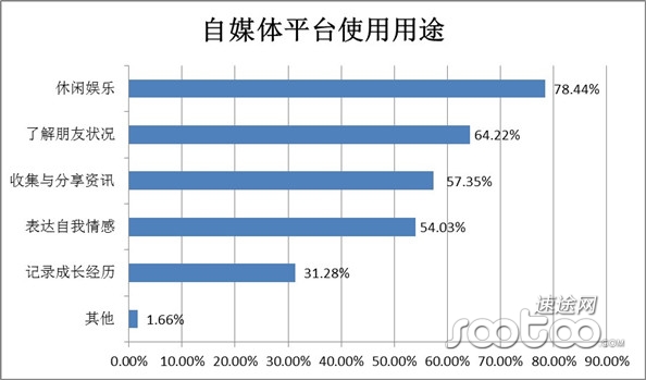 自媒体平台使用用途以休闲娱乐为主,78.44%的用户为了休闲娱乐使用自媒体平台。用户使用自媒体平台主要是为了放松心情、自我减压,休闲娱乐自然成为其首选用途。自媒体平台多以社交功能吸引用户,了解朋友状况是使用自媒体平台的另一大用途,64.22%的用户选择使用这一用途。57.35%的用户使用自媒体平台收集与分享资讯,54.03%的用户使用自媒体平台表达自我情感,31.28%的用户使用自媒体平台记录成长经历。用户使用自媒体平台更倾向于资源的获取,情感需求相对较少。