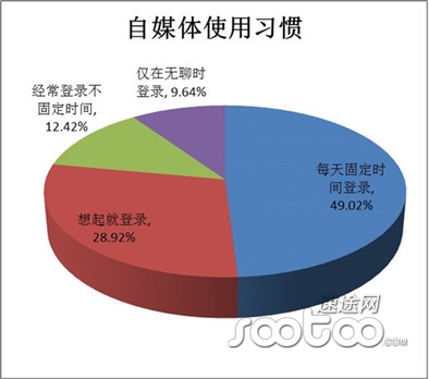 自媒体的使用习惯以每天固定时间登录为主,接近半数的人拥有这种使用习惯,人们每天在上班、学习中忙碌,自媒体作为一种、获取资讯、交流思想的方式,每天形成习惯固定时间登录,既能得到自己想要阅读的内容又不需要占用很长时间,许多人更愿意选择这样的使用习惯。28.92%的人使用自媒体的习惯为想起来就登录,这种使用习惯的人仅将自媒体看成是一种休闲娱乐的方式。12.42%的人经常登录不固定时间,9.64%的人仅在无聊时登录。