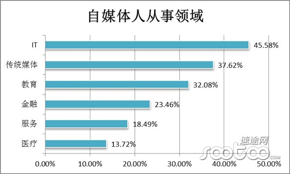自媒体主要从事的领域为IT领域,自媒体兴起于网络,能吸引众多IT评论者、电商分析者等研究互联网的相关领域人员,传统媒体也是现在自媒体人从事的重要领域,随着互联网的发展,许多传统媒体人开始转向自媒体,利用原有资源,经营自媒体更加有优势。还有许多自媒体人从事教育领域,以小故事的形式吸引大众。金融、服务医疗等领域也有一部分自媒体人从事。