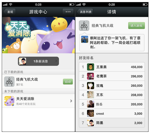 今天上午,腾讯手机QQ也同时更新新版本,其中就加入了游戏中心板块。微信的游戏中心事实上也是腾讯移动游戏平台的组成部分,上线的游戏包括《经典飞机大战》与《天天爱消除》两款手机游戏,比手机QQ多一款。用户可以在游戏中心直接下载并启动游戏,游戏过程中可以与微信好友互动,并查看朋友圈中的游戏排行榜。