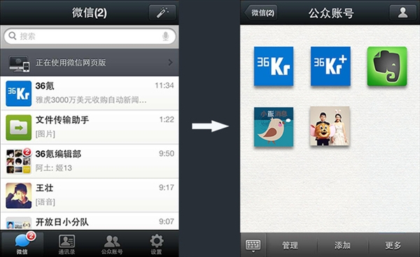 管鹏透露,微信5.0的新功能几乎都与公众平台有关: