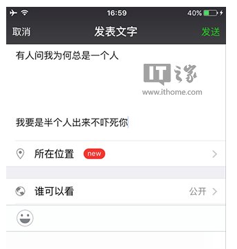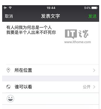 1、首先在朋友圈发消息界面将你想要发送的段子打好,未必一定是两句话,但最好精辟,这样才有效果。将要隐藏在点击全文后才能看到的话单独一行显示。