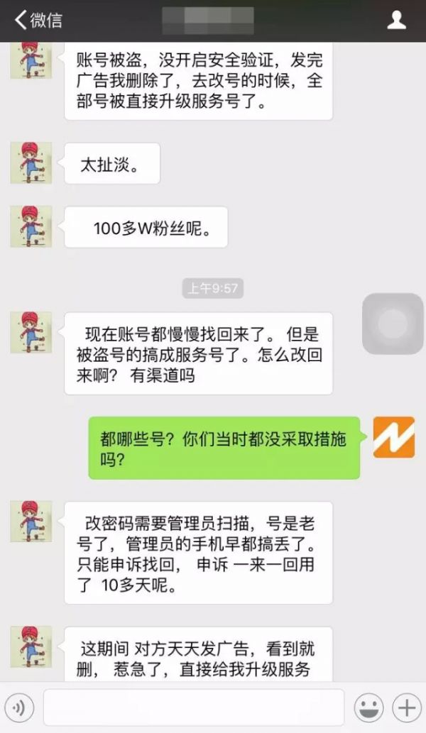 在此之前,微信公众号被盗事件也有发生,据其中一位受害者爆料称,号被盗后对方每天疯狂发广告以谋取非法利益,在所发广告被删除后,盗号者更是报复性地将订阅号升级为服务号,造成不可挽回的损失,多年辛苦一夕之间付诸东流。