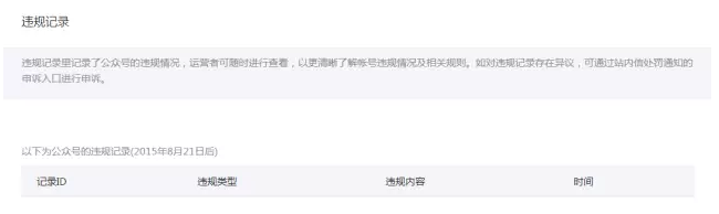 新榜讯 今日新榜从业界获得资讯,微信后台违规中心中的历史记录已被清空,多名微信公众号的运营人员向新榜证实了这一消息。目前违规中心中只显示2015年8月21日之后的记录,此前违规历史记录消失不见。根据业界推测,微信官方可能是每年会清空一次上一年的违规记录,但官方目前暂无任何说明。